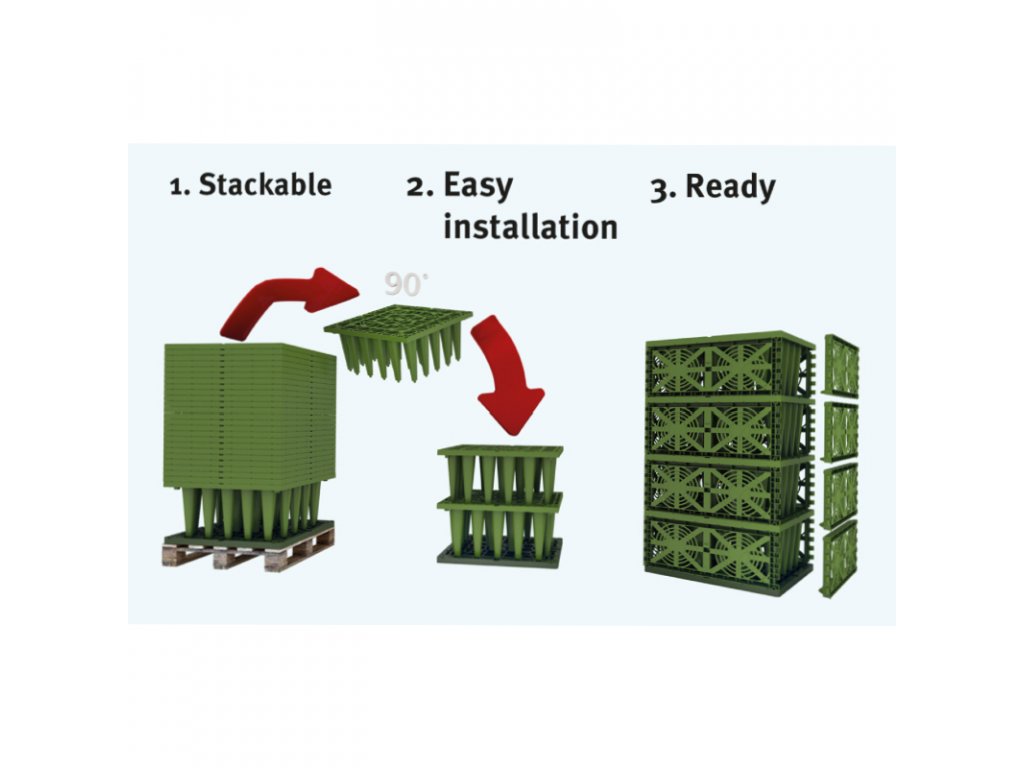 Pro jednu vrstvu bloků 225 l je třeba stejný počet podkladových desek jako bloků. Při instalaci do více vrstev potřebujete podkladové desky jen pro spodní vrstvu, další vrstvy bloků se již instalují bez podkladových desek. Tělo bloku nemá žádné boky, takže je potřeba v obou směrech dokoupit zakončení (1 pár = 1 ks). Při skládání většího objektu bloků tedy potřebujete počet ks zakončení, aby byl roven počtu ks bloků na šířku + na délku objektu násobeného počtem vrstev. Pro horizontální uložení je potřeba dokoupit Spojky pro horizontální spojení Ecobloc Inspect - 1 ks. Pro správnou funkčnost je zapotřebí obalit bloky do geotextilie.